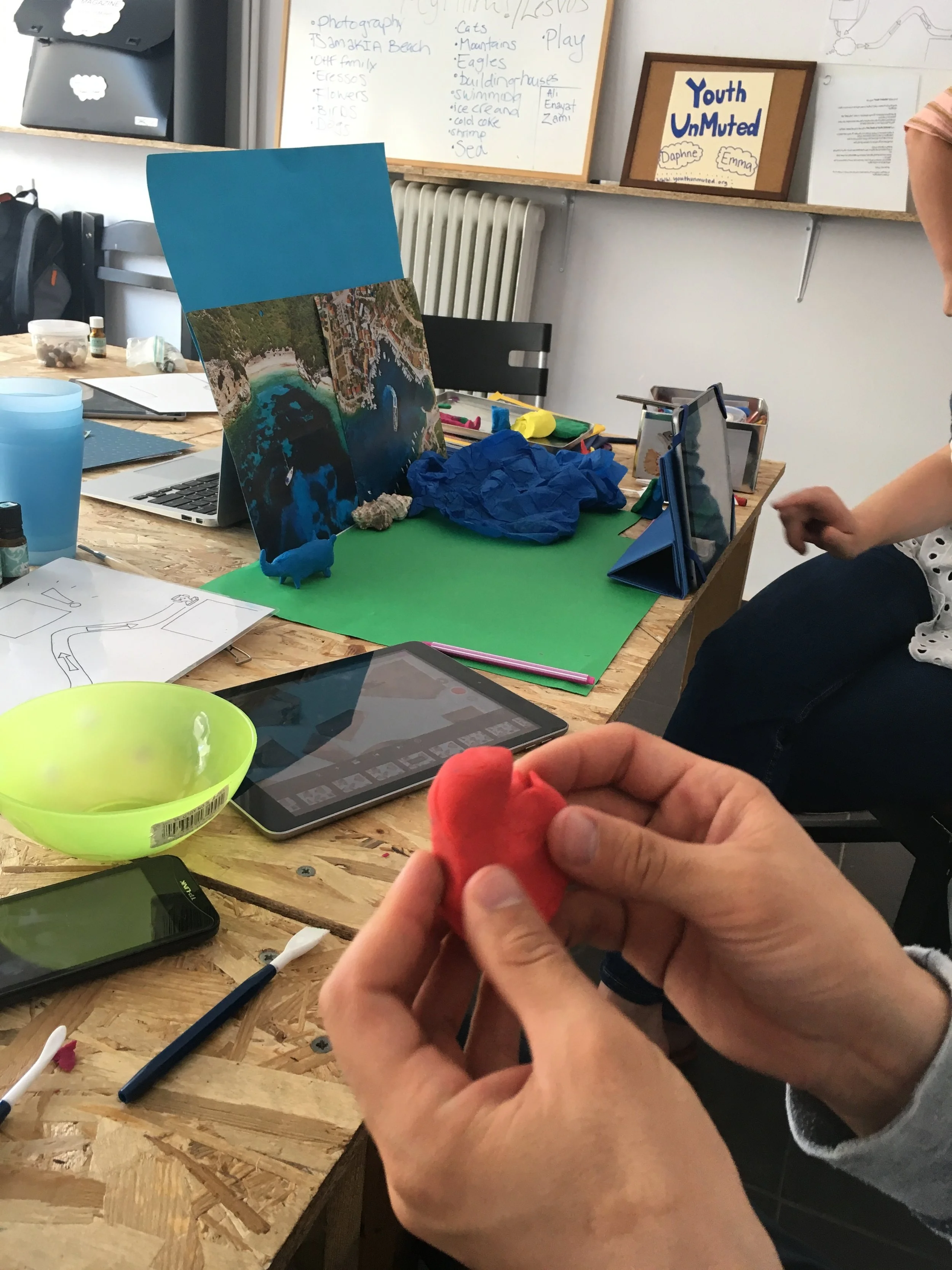 For this workshop guest facilitated by Youth UnMuted, we asked participants "What makes you happy in Mytilini?" Their answers were then transformed into short stop motion animations. The results were screened at a joint interactive exhibition with the Mosaik Support Centre where guests were invited to create their own DIY animations.